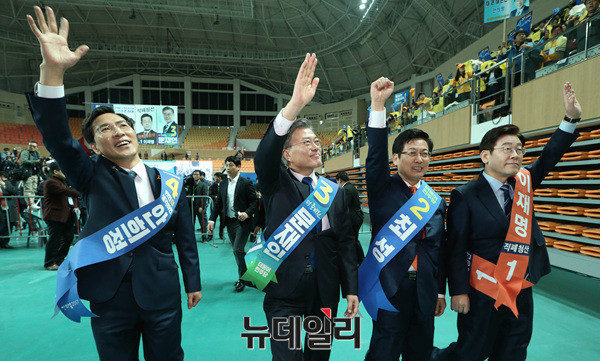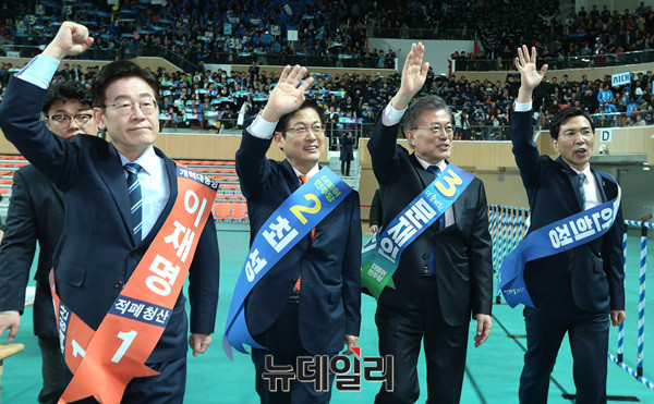더불어민주당 대선주자들(문재인 전 대표, 안희정 충남지사, 이재명 성남시장, 최성 고양시장)이 27일 오후 전남 광주여대시립유니버시아드체육관에서 열린 더불어민주당 '제19대 대통령후보자 호남권역선출대회'에 입장하고 있다.