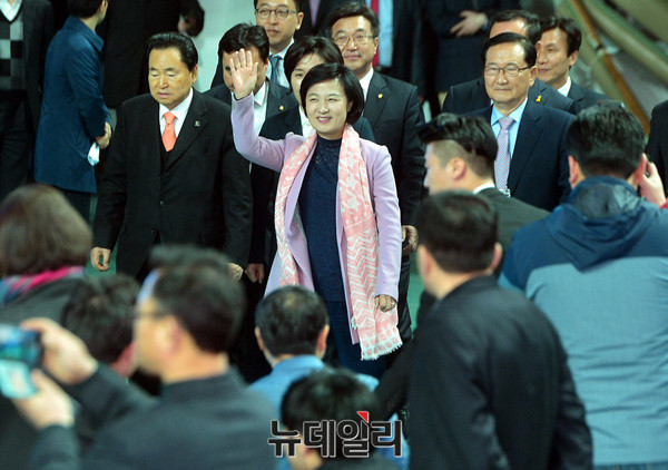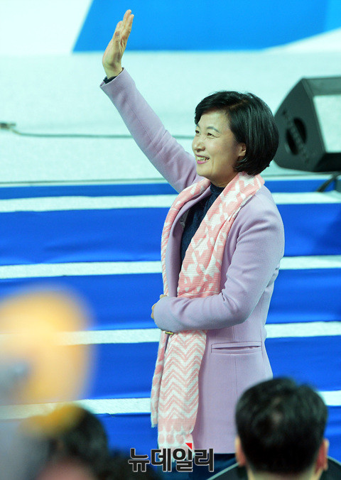 더불어민주당 추미애 대표가 27일 오후 전남 광주여대시립유니버시아드체육관에서 열린 더불어민주당 '제19대 대통령후보자 호남권역선출대회'에 입장하고 있다.