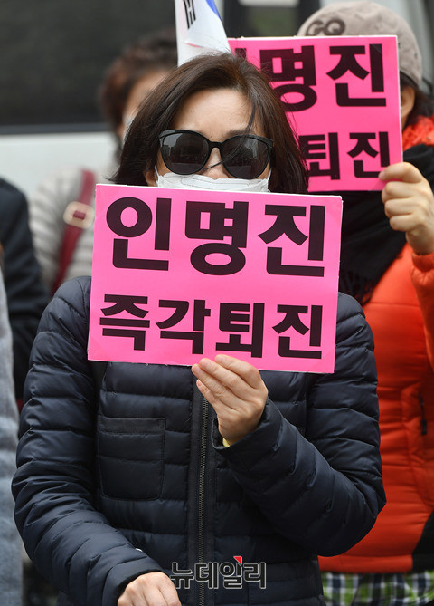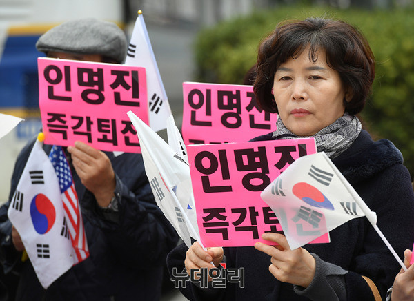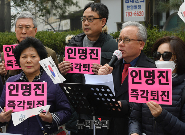자유수호국민연합을 비롯한 애국단체가 28일 오전 서울 영등포구 자유한국당사 앞에서 인명진 비대위원장 퇴진을 촉구하는 기자회견을 열었다. 이날 기자회견에는 장은경 자유북한청년포럼 부대표, 윤치환 바른교육학부모연합 안산시 대표, 임하리 자유수호국민연합 청년대표, 변희재 전 미디어워치 대표 등이 인 비대위원장의 사퇴를 촉구하는 발언을 했다.