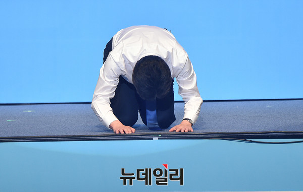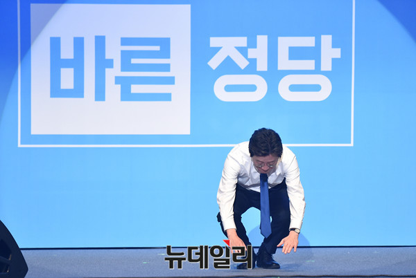 바른정당 제19대 대통령후보자 선출대회가 28일 오후 서울 송파구 올림픽공원 올림픽홀에서 열린 가운데 출마를 선언한 유승민 경선후보가 큰절을 하고 있다.