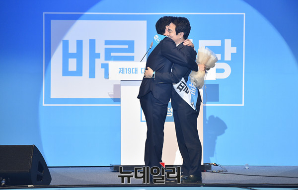 바른정당 대선 후보로 선출된 유승민 의원이 28일 오후 서울 송파구 올림픽공원 올림픽홀에서 열린 '제19대 대통령후보자 선출대회'에서 낙선한 남경필 경기도지사와 위로와 축하를 주고받고 있다.
