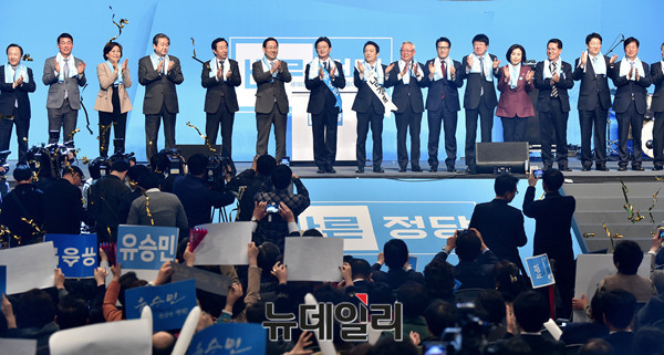 바른정당 대선 후보로 선출된 유승민 의원이 28일 오후 서울 송파구 올림픽공원 올림픽홀에서 열린 '제19대 대통령후보자 선출대회'에서 낙선한 남경필 경기도지사, 주호영 원내대표 등 지도부와 함께 손을 들어 인사하고 있다.