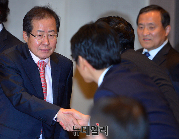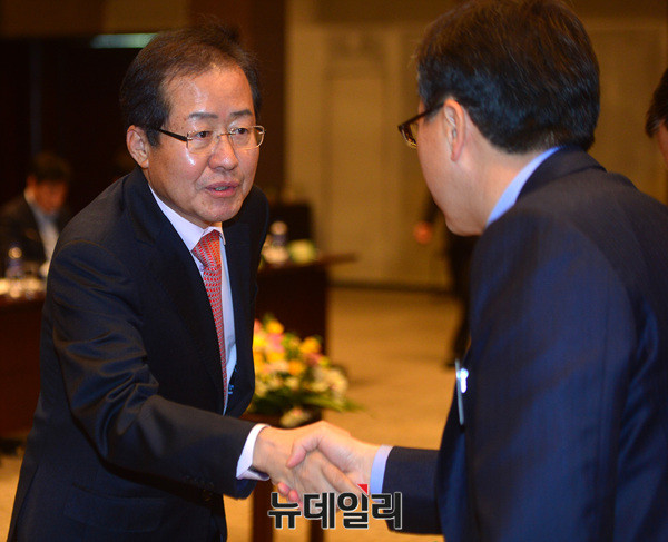대선출마를 선언한 자유한국당 홍준표 경남지사가 29일 오전 한국프레스센터에서 열린 편집인협회 세미나에 참석해 악수를 나누고 있다. 이날 홍 지사는 세미나에서 대선주자로서 정책방향에 대해 이야기했다.