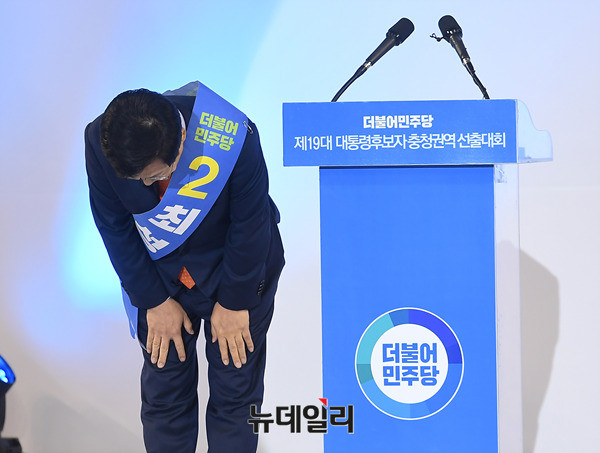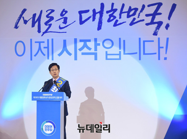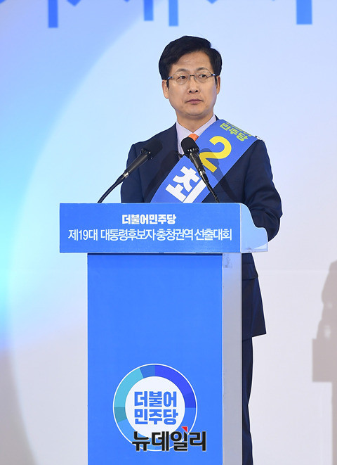 최성 더불어민주당 대선주자가 29일 오후 2시부터 대전 중구 충무체육관에서 열린 충청권역 선출대회에서 기조연설을 하고 있다. 결과는 오후 6시 30분이 넘어 나올 예정이다. (대전=뉴데일리 정상윤 기자)