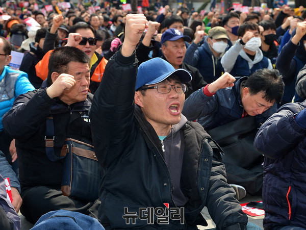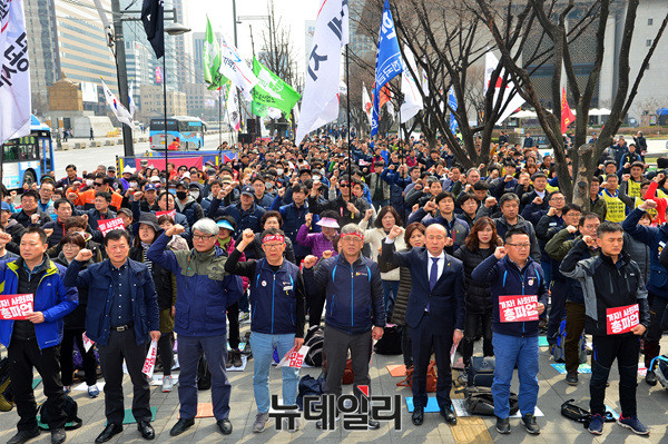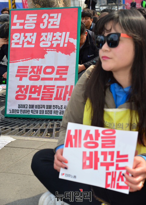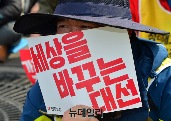 전국민주노동조합총연맹(민노총)이 29일 오후 서울 세종로소공원에서 '세상을바꾸는 대선 노동존중 평등사회로'라는 주제로 결의대회를 개최했다. 이날 민노총은 최저임금 1만원 개선, 사드배치 반대 등 요구 사항을 관철하기 위한 대선투쟁에 나서겠다고 밝혔다.