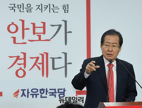 홍준표 자유한국당 대선주자가 30일 오전 서울 영등포구 자유한국당사에서 기자회견을 열고 "국민들의 수돗물에 대한 불신을 불식시키고, 깨끗한 식수 공급을 위해 식수댐을 건설해 1급수를 식수원으로 확보하겠다"고 밝혔다.