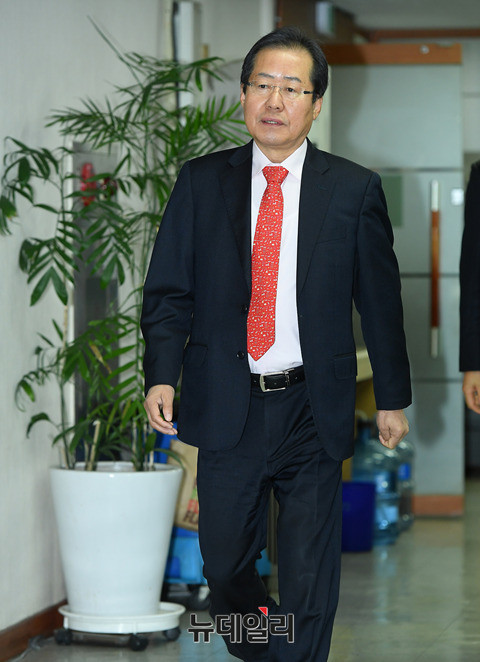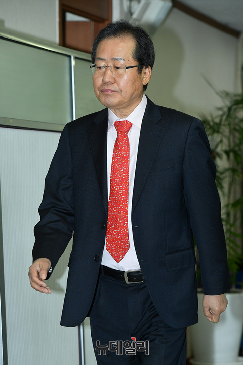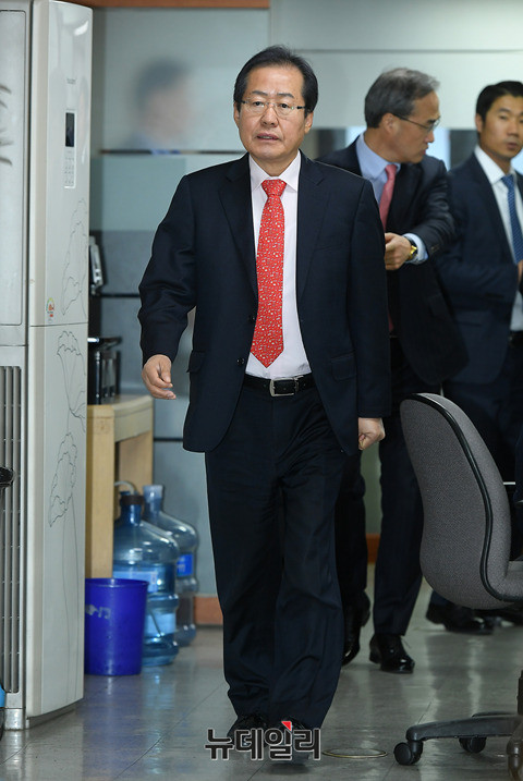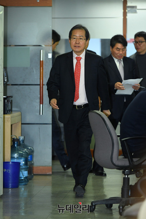 홍준표 자유한국당 대선주자가 30일 오전 서울 영등포구 자유한국당사에서 식수정책 관련 기자회견을 위해 입장하고 있다. 홍 주자는 "국민들의 수돗물에 대한 불신을 불식시키고, 깨끗한 식수 공급을 위해 식수댐을 건설해 1급수를 식수원으로 확보하겠다"고 밝혔다.