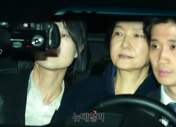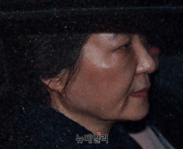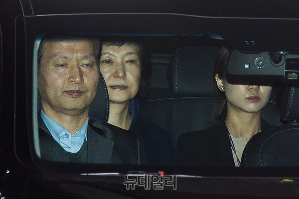 박근혜 전 대통령이 31일 새벽 서울중앙지검에서 영장실질심사 대기 중 구속이 확정되자 차량에 탑승해 서울구치소로 이동하고 있다. (사진=공동취재단)