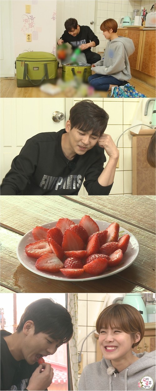 장도연이 가상남편 최민용을 능가하는 비상식량가방을 공개했다.4월 1일 방송될 MBC '우리 결혼했어요'(이하 '우결')에서는 국화도에서 살아남기 위해 비상식량가방을 마련한 장도연의 모습이 전파를 탄다.앞서 최민용은 장도연과의 첫 만남에서 비상식량가방을 준비해 장도연을 깜짝 놀라게 했다. 이날 장도연은 남편 못지 않은 실속 가득 비상식량가방을 가져와 최민용을 흐뭇하게 만들었다.최민용은 장도연의 큰 가방에 관심을 보였고, 장도연은 "에너지바로는 안될 거 같아서.."라고 말하며 가방 안에서 섬에서 살아남기 위해 필요한 아이템들을 쏟아냈다.이 모습에 최민용은 크게 웃다가 "그날 진짜 배 많이 고팠어요?"라고 물으며 미안한 기색을 내비쳤다. 또한.장도연의 비상식량가방 안에는 특별한 아이템이 숨겨져 있었는데, 이는 바로 딸기였다.장도연은 최민용이 딸기를 좋아한다는 것을 기억해 이를 준비해왔고, 손재주를 발휘해 '딸기꽃'까지 만든 것. 이에 최민용은 감동해 얼굴이 빨개졌고, 웃음을 감추지 못한 것으로 전해져 궁금증을 자아낸다.'우리 결혼했어요'는 4월 1일 오후 4시 55분 방송된다.['우리 결혼했어요' 장도연 최민용, 사진=MBC]