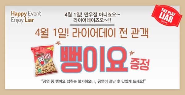 연극 '라이어'가 4월 1일 만우절을 맞이해 특별한 이벤트를 마련했다.만우절에 '라이어' 1탄과 2탄을 관람하는 모든 관객에게 과자 '뻥이요'를 증정하는 '라이어데이 이벤트'를 펼친다.연극 '라이어'는 지금도 유럽, 아시아를 비롯한 전 세계 60여개 나라에서 공연되고 있을 만큼 큰 인기를 누리고 있으며, 그 중 한국에서만 유일하게 20년째 공연 중이다.1998년 초연 이래 총 35000회를 넘겼고, 누적관객 500만명을 돌파하며 '국내 최장기·최대 공연 횟수·최대 관객'이라는 기록을 매일 갱신하고 있다. 배우 안내상, 이문식, 정재영, 이종혁, 우현, 김성균, 오정세, 오대환 등 실력파 배우들이 출연하기도 했다.국민연극 '라이어'는 대학로 아트포레스트 1관, 2관에서 오픈런 공연한다. 전석 3만5천원. 문의 02-747-2070.[사진=파파프로덕션]
