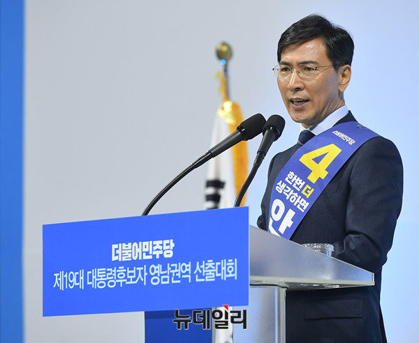 민주당 경선주자 안희정 후보는 "자신의 인생을 걸도 도전했던 영남의 당원들, 지역위원장들은 민주당의 자부심"이라고 외쳤다.