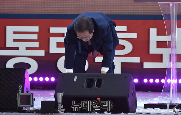 19대 대통령 후보 선출을 위한 자유한국당 1차 전당대회가 31일 오후 서울 중구 장충체육관에서 열린 가운데 대선후보로 당선된 홍준표 경남도지사가 큰절을 하고 있다.