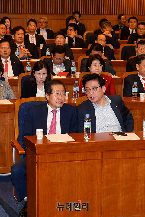홍준표 자유한국당 대선후보와 정우택 원내대표가 1일 오후 국회 헌정기념관 대회의실에서 국회의원·당협위원장 연석회의에 참석해 자유토론을 앞두고 대화를 나누고 있다. 이날 회의에는 홍준표 대선후보자, 정우택 원내대표, 정책위의장 등 소속 국회의원과 원외당협위원장이 참석해 대선 승리에 관해 논의했다.
