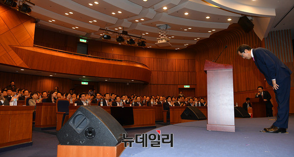 홍준표 자유한국당 대선후보가 1일 오후 국회 헌정기념관 대회의실에서 국회의원·당협위원장 연석회의에 참석해 모두 발언 후 인사를 하고 있다. 이날 회의에는 홍준표 대선후보자, 정우택 원내대표, 정책위의장 등 소속 국회의원과 원외당협위원장이 참석해 대선 승리에 관해 비공개로 진행됐다.
