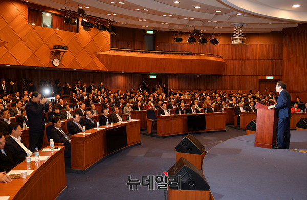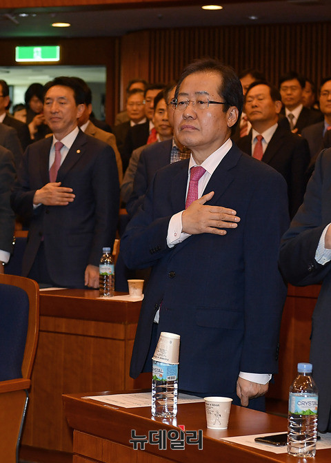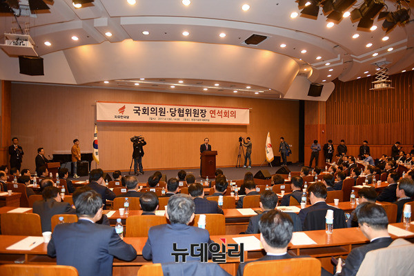 정우택 자유한국당 원내대표, 홍준표 대선후보(오른쪽부터)가 1일 오후 국회 헌정기념관 대회의실에서 국회의원·당협위원장 연석회의에 참석해 미소를 짓고 있다. 이날 회의에는 홍준표 대선후보자, 정우택 원내대표, 정책위의장 등 소속 국회의원과 원외당협위원장이 참석해 대선 승리에 관해 논의했다.