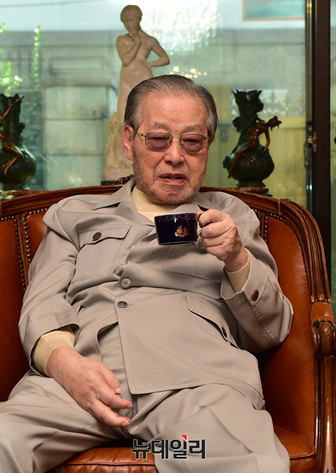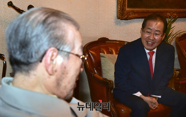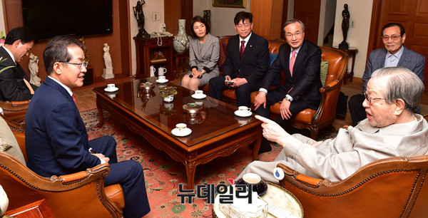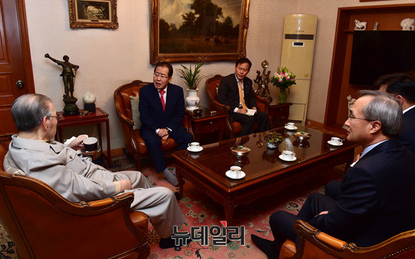 홍준표 자유한국당 대선후보가 3일 오후 서울 중구 신당동에 위치한 김종필 전 국무총리 자택을 찾아 환담을 나누고 있다. 앞서 홍 후보는 이명박 전 대통령을 예방했다. (사진=공동취재단)