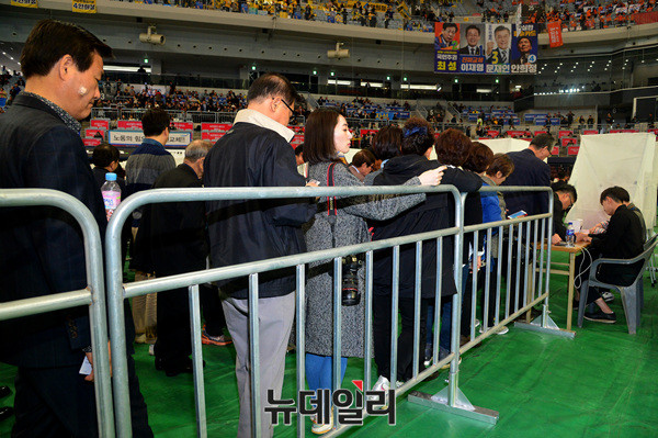 더불어민주당 '제19대 대통령후보자 대통령후보자 수도권·강원·제주선출대회'에 참석한 선거인단이3일 오후 서울 구로구 고척스카이돔에서 대의원 투표를 하고 있다.