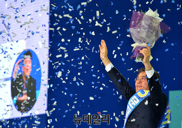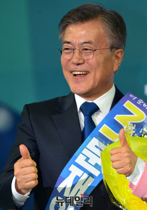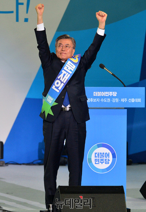 더불어민주당 대선후보로 확정된 문재인 전 대표가 3일 오후 서울 구로구 고척스카이돔에서 열린 더불어민주당 '제19대 대통령후보자 수도권·강원·제주선출대회'에서 손을 들어 보이고 있다. 이날 문 전 대표는 총 39만9934표를 득표해 60.4%를 차지했다. 누적 득표율은 57%를 기록했다.
