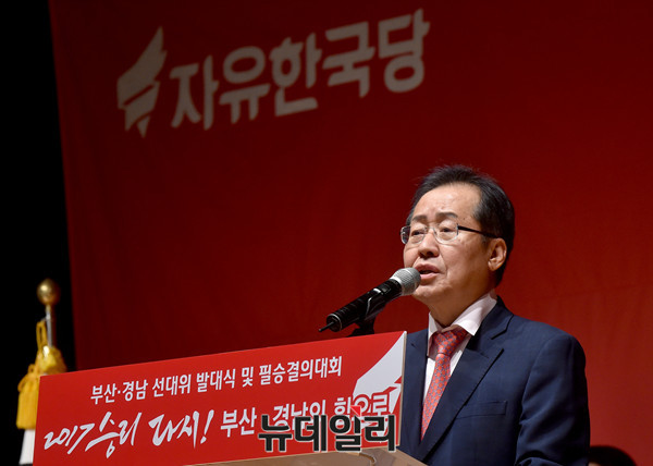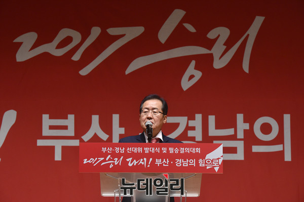 자유한국당 홍준표 대선후보가 5일 오후 부산광역시 해운대구 벡스코 컨벤션홀에서 열린 '부산-경남 선대위 발대식'에 참석해 발언을 하고 있다. (부산=뉴데일리 이종현 기자)