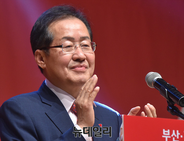 자유한국당 홍준표 대선후보가 4일 오후 부산광역시 해운대구 벡스코 컨벤션홀에서 열린 부산경남 선대위발대식에 참석해 노래(부산갈메기, 돌아와요 부산항에)에 맞춰 박수를 치고 있다. (부산=뉴데일리 이종현 기자)