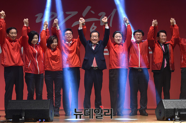 [포토] 부산갈매기 맞춰 박수치는 홍준표 후보와 지도부