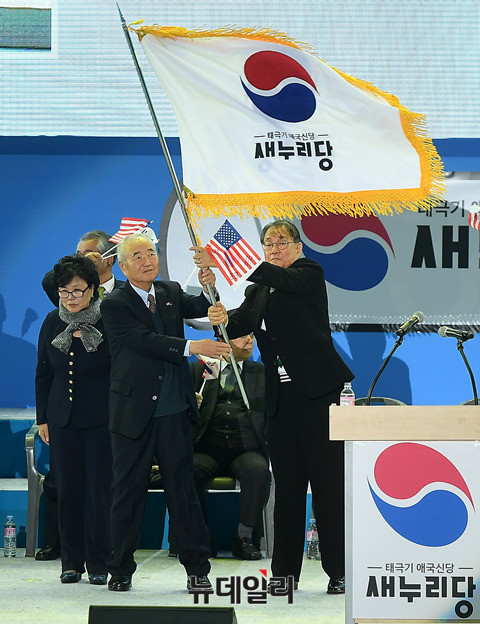 권영해, 정광택 초대 공동당대표가 5일 오후 서울 중구 장충체육관에서 열린 태극기 애국신당 새누리당 중앙당 창당대회에서 당기를 흔들고 있다.