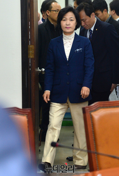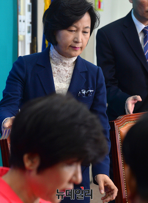 추미애 더불어민주당 대표가 5일 오전 국회에서 열린 최고위원회의에 입장하고 있다.