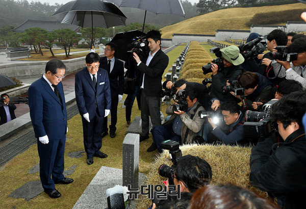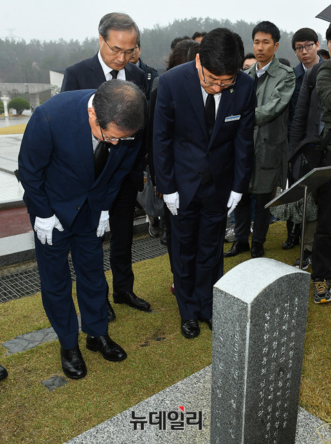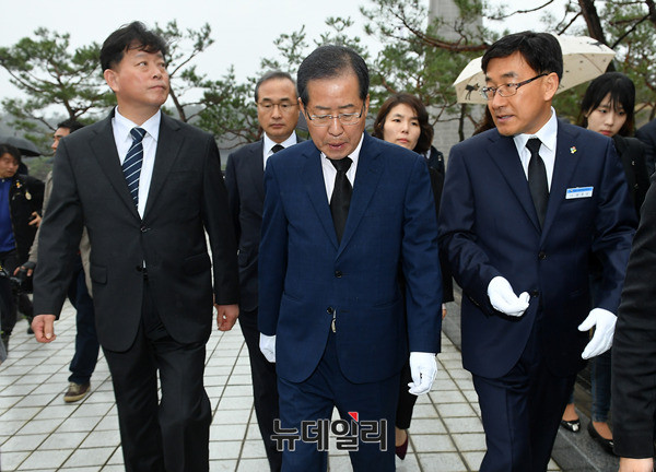 홍준표 자유한국당 대선후보가 6일 오전 광주 북구 국립5.18민주묘지를 찾아 희생자의 묘비를 만지고 있다. (광주=뉴데일리 정상윤 기자)