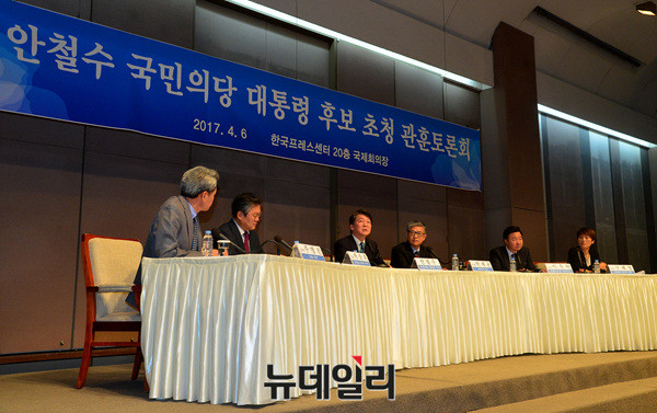 안철수 국민의당 대선후보가 6일 오전 한국프레스센터에서 열린 관훈토론회에 참석해 질문에 답하고 있다. 이날 관훈토론회는 박제균 관훈클럽 총무(동아일보 논설실장)의 사회로 구혜영 경향신문 정치부 차장, 박승희 중앙일보 편집국 부국장, 이우탁 연합뉴스TV 정치부장, 주영진 SBS 앵커가 토론자로 나섰다.