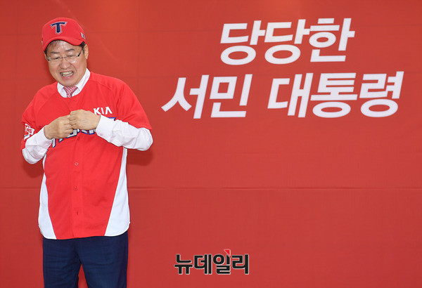 홍준표 자유한국당 대선후보가 6일 오전 광주 북구 자유한국당 광주시당에서 열린 호남·제주권 시도당 선대위 발대식 및 필승결의대회에서 기아타이거즈 유니폼을 입고 역전 말루홈런 퍼포먼스를 선보이고 있다. (광주=뉴데일리 정상윤 기자)