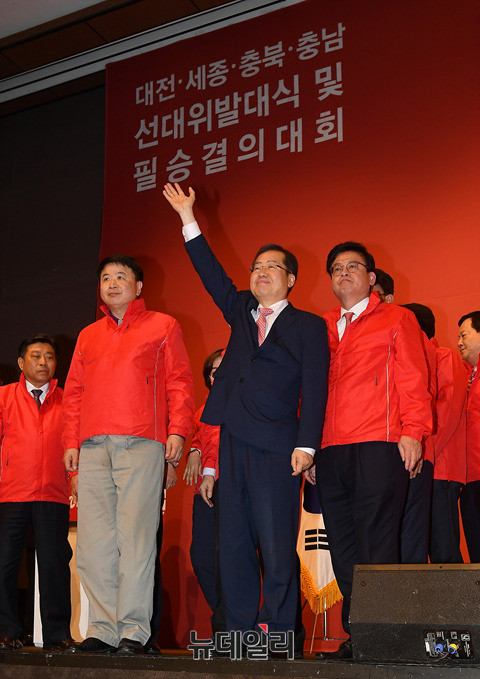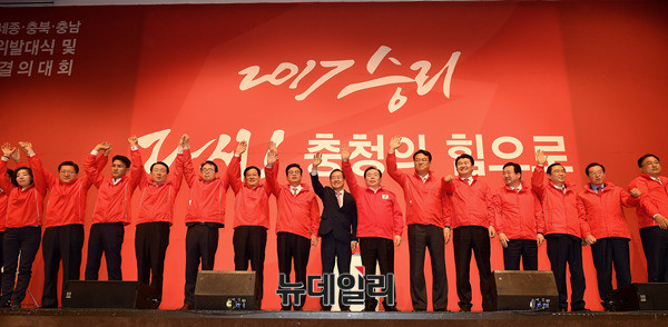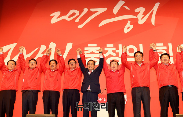 홍준표 자유한국당 대선후보, 정우택 원내대표, 이인제 전 최고위원, 정진석 전 원내대표 등 지도부가 6일 오후 대전 유성구 호텔ICC에서 열린 충청권 선대위발대식 및 필승결의대회에서 손을 들어 필승을 다짐하고 있다. 앞서 홍 후보는 오전 광주를 방문했다. (대전=뉴데일리 정상윤 기자)