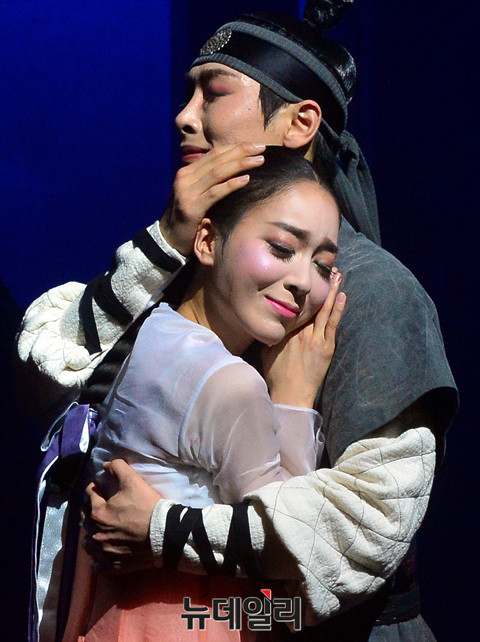 전통 공연 '련,다시피는꽃'의 배우들(조하늘, 전진홍)이 6일 오후 서울 정동극장에서 열린 프레스콜에서 하이라이트 장면을 시연하고 있다.