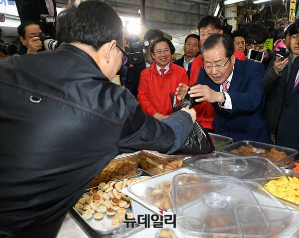 홍준표 자유한국당 대선후보가 6일 오후 대전 동구 중앙철도시장을 방문해 구입한 과자봉지를 건네 받고 있다. 앞서 홍 후보는 이날 오전 광주5.18민주묘지를 방문하고, 광주시당을 방문해 필승대회에 참석했다. 오후에 대전으로 이동해 충청권 필승대회에 참석했다. (대전=뉴데일리 정상윤 기자)