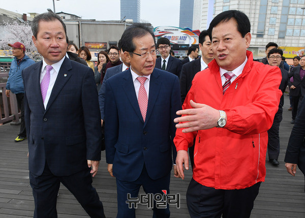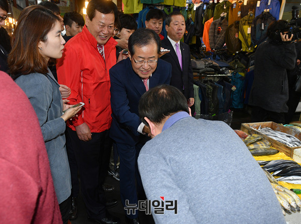 홍준표 자유한국당 대선후보가 6일 오후 대전 동구 중앙철도시장을 방문해 김밥집 상인과 대화를 나누고 있다. 앞서 홍 후보는 이날 오전 광주5.18민주묘지를 방문하고, 광주시당을 방문해 필승대회에 참석했다. 오후에 대전으로 이동해 충청권 필승대회에 참석했다. (대전=뉴데일리 정상윤 기자)
