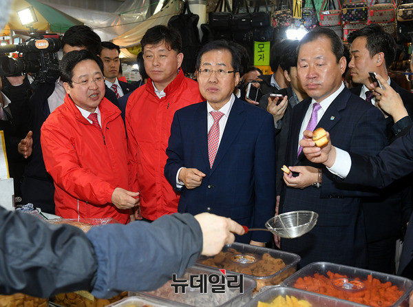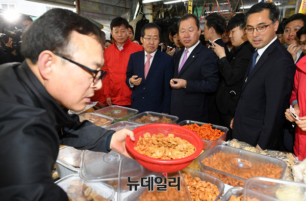 홍준표 자유한국당 대선후보가 6일 오후 대전 동구 중앙철도시장을 방문해 과자를 구입하고 있다. 앞서 홍 후보는 이날 오전 광주5.18민주묘지를 방문해 참배하고, 광주시당을 방문해 필승대회에 참석했다. 오후에 대전으로 이동해 충청권 필승대회에 참석했다. (대전=뉴데일리 정상윤 기자)