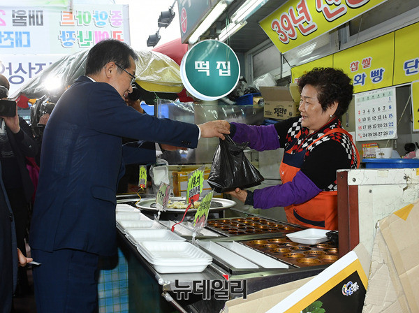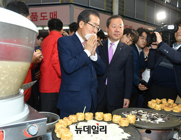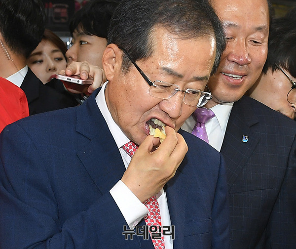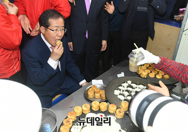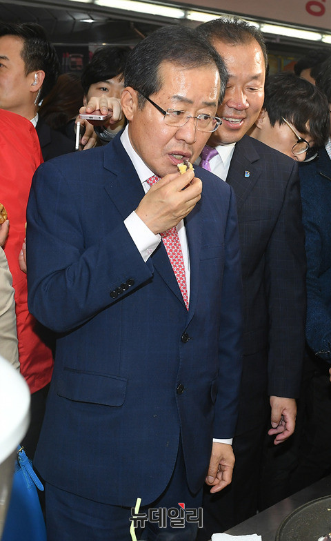 홍준표 자유한국당 대선후보가 6일 오후 대전 동구 중앙철도시장을 방문해 국화빵을 먹고 있다. 앞서 홍 후보는 이날 오전 광주5.18민주묘지를 방문해 참배하고, 광주시당을 방문해 필승대회에 참석했다. 오후에 대전으로 이동해 충청권 필승대회에 참석했다. (대전=뉴데일리 정상윤 기자)