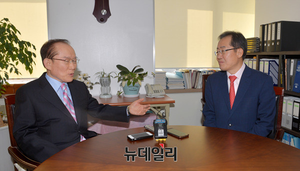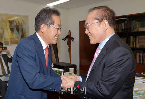 홍준표 자유한국당 대선 후보가 7일 오전 서울 중구 남대문로 단암빌딩 이회창 전 한나라당 총재 사무실을 방문해 악수를 나누고 있다. (사진=공동취재단)