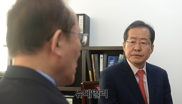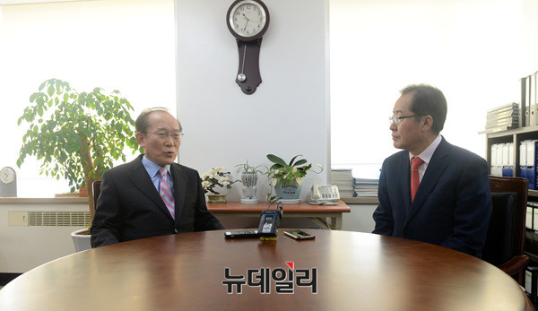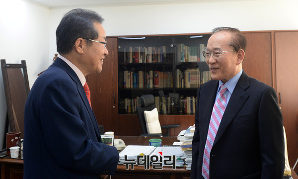 홍준표 자유한국당 대선 후보가 7일 오전 서울 중구 남대문로 단암빌딩 이회창 전 한나라당 총재 사무실을 방문해 악수를 나누고 있다. 홍 후보는 이날 오후 안양 실내체육관에서 열리는 경기·인천 자유한국당 선대위발대식에 참석할 예정이다. (사진=공동취재단)
