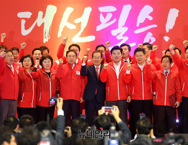 홍준표 자유한국당 대선 후보가 7일 오후 경기 안양시 안양실내체육관에서 열린 경기·인천 선대위 발대식 겸 필승대회에서 선대위원장들과 화이팅을 외치고 있다. 홍 후보는 필승대회에 이어 안양중앙시장을 방문해 시민들을 만날 예정이다. (경기 안양=뉴데일리 정상윤)