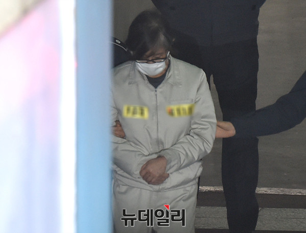 박근혜 정부의 국정농단 사건으로 구속된 최순실이 7일 오전 서울 서초구 서울중앙지방법원에서 열린 11차 공판에 출석하고 있다.