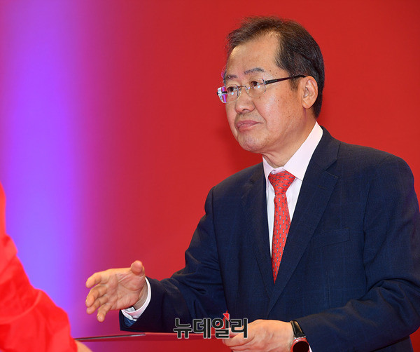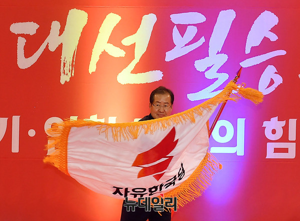 홍준표 자유한국당 대선 후보가 7일 오후 경기 안양시 안양실내체육관에서 열린 경기·인천 선대위 발대식 겸 필승대회에서 이우현 의원에게 임명장을 수여하고 있다. 홍 후보는 필승대회에 이어 안양중앙시장을 방문해 시민들을 만날 예정이다. (경기 안양=뉴데일리 정상윤)