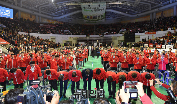 홍준표 자유한국당 대선 후보가 7일 오후 경기 안양시 안양실내체육관에서 열린 경기·인천 선대위 발대식 겸 필승대회에 입장하고 있다. 홍 후보는 필승대회에 이어 안양중앙시장을 방문해 시민들을 만날 예정이다. (경기 안양=뉴데일리 정상윤)