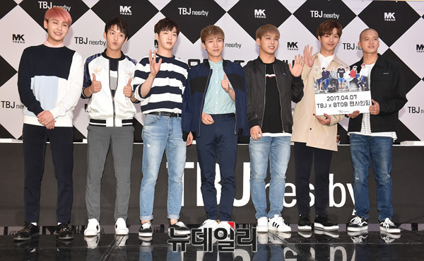 아이돌 그룹 비투비(BTOB)가 7일 오후 서울 송파구 잠실 롯데월드몰 아트리움 광장에서 열린 캐주얼 브랜드 'TBJ' 팬사인회에 참석해 포토타임을 갖고 있다. 왼쪽부터 정일훈, 이민혁, 이창섭, 서은광, 임현식, 육성재, 프니엘