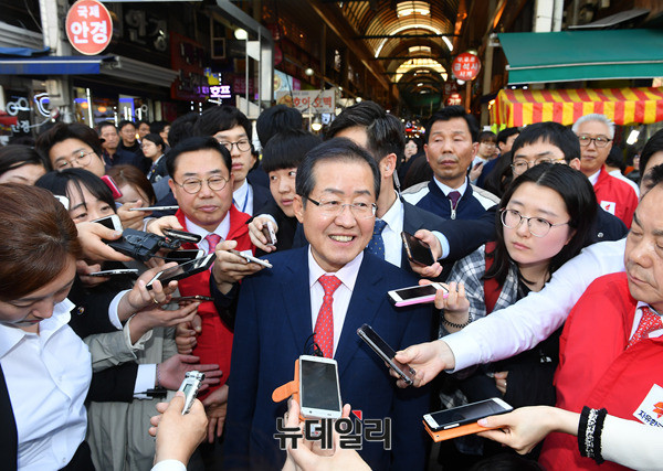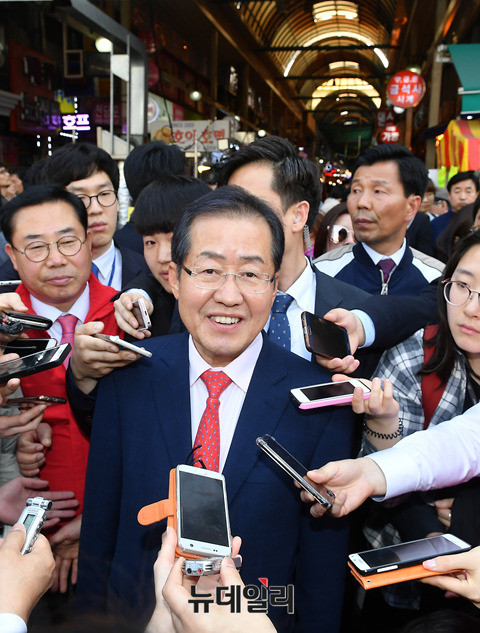 홍준표 자유한국당 대선 후보가 7일 오후 경기 안양시 안양중앙시장을 방문해 분식으로 간단히 식사를 하고 차에 오르기 전 취재진의 질문에 답하고 있다. 앞서 홍 후보는 안양실내체육관에서 열린 경기·인천 선대위 발대식에 참석했다. (경기 안양=뉴데일리 정상윤)