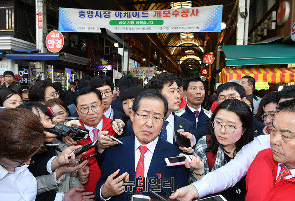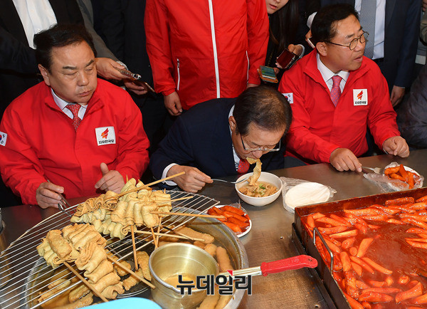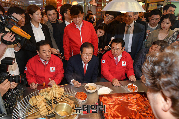 홍준표 자유한국당 대선 후보가 7일 오후 경기 안양시 안양중앙시장을 방문해 어묵을 먹으며 상인과 대화를 나누고 있다. 앞서 홍 후보는 안양실내체육관에서 열린 경기·인천 선대위 발대식에 참석했다. (경기 안양=뉴데일리 정상윤)