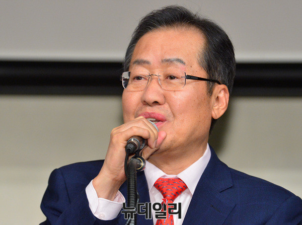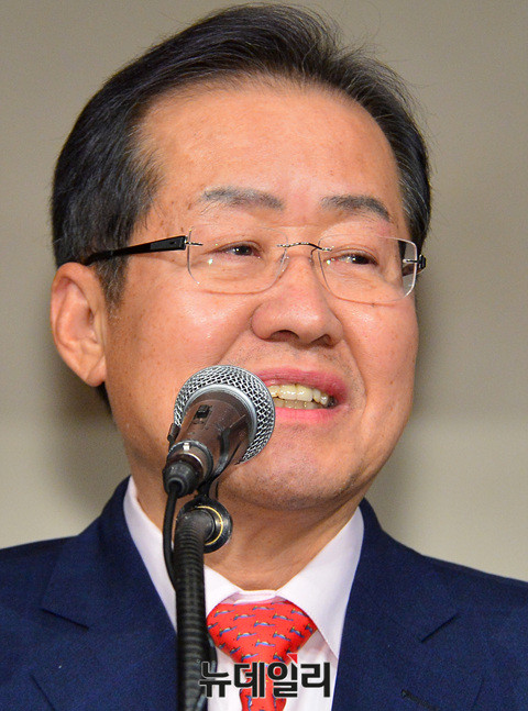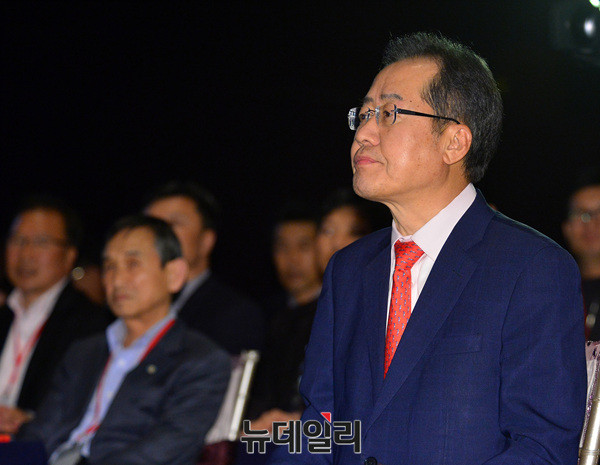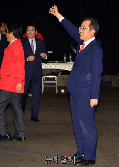홍준표 자유한국당 대선후보가 7일 오후 서울 영등포 타임스퀘어에서 열린 제19대 대통령선거 시·도 선대위 회의에 참석해 손을 흔들고 있다. 이날 회의는 비공개로 진행됐다.