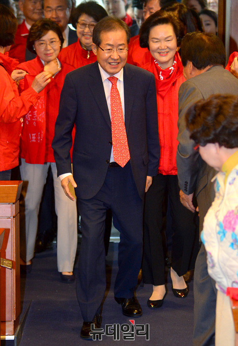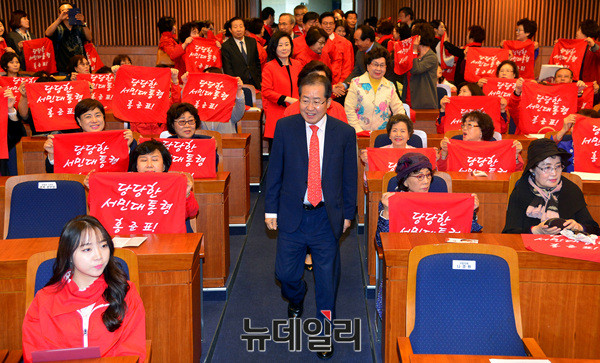 홍준표 자유한국당 대선후보가 8일 오전 국회 헌정기념관에서 열린 '중앙 및 시도 선대위 여성본부 필승결의대회'에 입장하고 있다. 홍 후보는 이날 오후 장충체육관에서 열리는 중앙선대위발대식 및 서울·강원 필승대회에 참석할 예정이다.