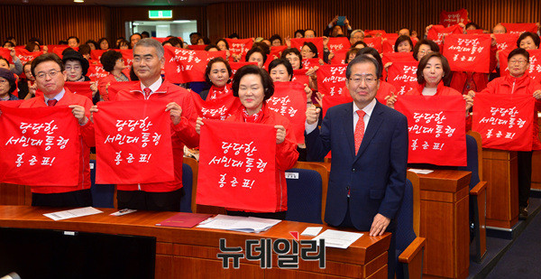 홍준표 자유한국당 대선후보가 8일 오전 국회 헌정기념관에서 열린 '중앙 및 시도 선대위 여성본부 필승결의대회'에 참석했다. 홍 후보는 이날 오후 장충체육관에서 열리는 중앙선대위발대식 및 서울·강원 필승대회에 참석할 예정이다.