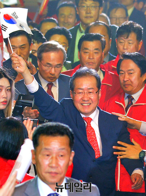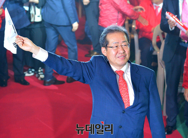 홍준표 자유한국당 대선후보가 8일 오후 서울 중구 장충체육관에서 열린 '중앙선대위발대식 및 서울·강원 필승대회'에 입장하고 있다. 홍 후보는 이날 오전 중앙 및 시도 선대위 여성본부 필승결의대회에 참석했다.