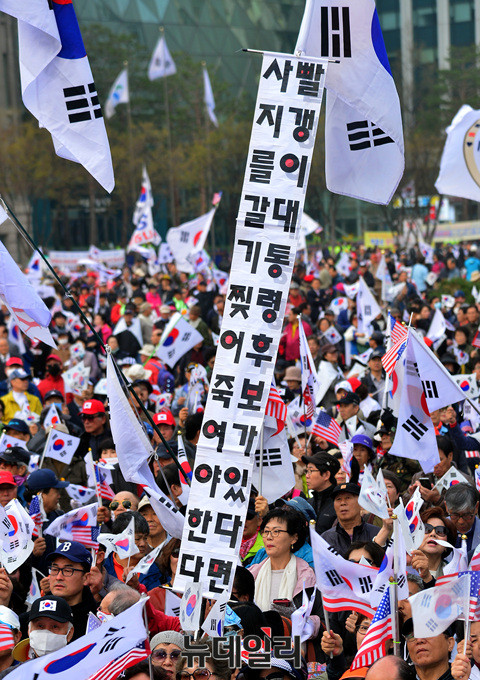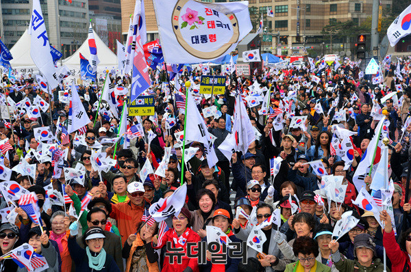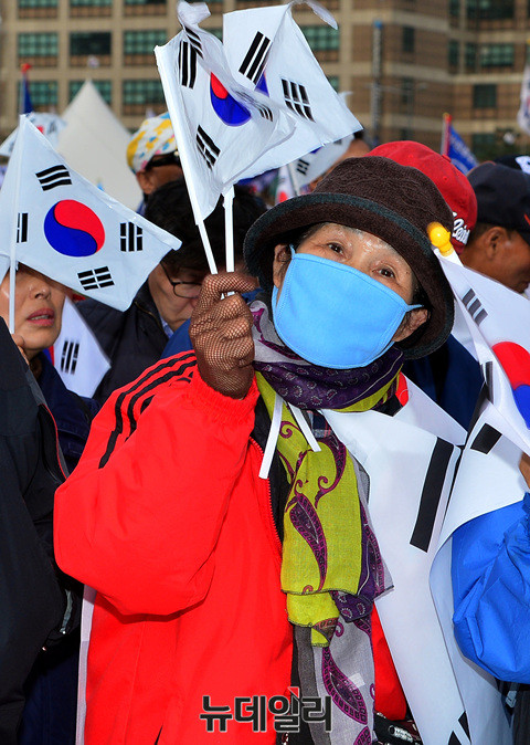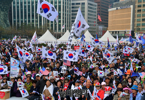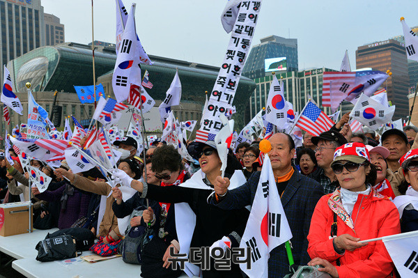 국민저항본부가 8일 오전 대한문 일대에서 박근혜 전 대통령 탄핵무효를 촉구하는 '제5차 탄핵무효 국민저항총궐기국민대회'를 개최했다.이날 집회에 참석한 시민들은 태극기와 성조기를 흔들며 "탄핵무효"를 외쳤다.